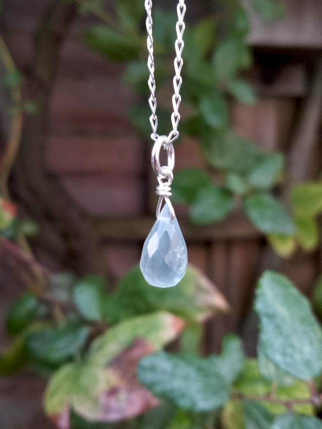 All sterling silver with genuine Aquamarine on an 18" chain. Please see images for pendant sizes. Matching earrings also available.