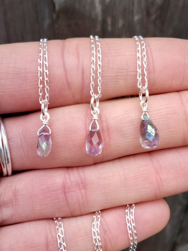Delicate Amethyst pendants coated in a soft layer of aura rainbow, adding a little extra magic.