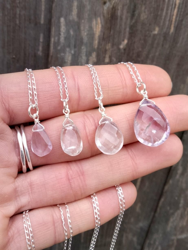 Hand cut Pink Amethyst on an 18" sterling silver chain. Colours range from pale pink to lilac. Every piece twinkles in the light!