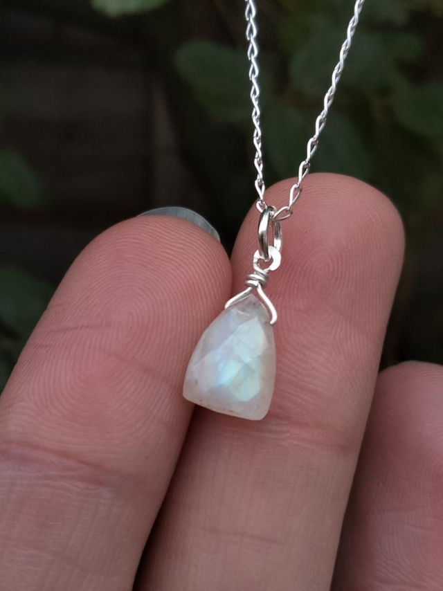All sterling silver with genuine Rainbow Moonstone on an 18" chain.