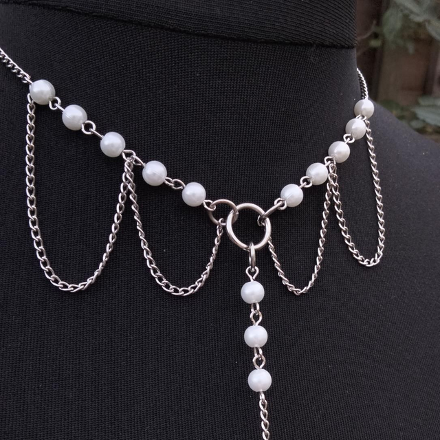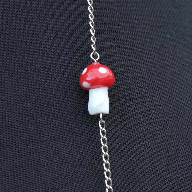 This surprisingly lightweight body chain is inspired by the Red Amanita mushroom. Plastic pearl beads, glass lampwork mushroom bead, with titanium toned findings.
